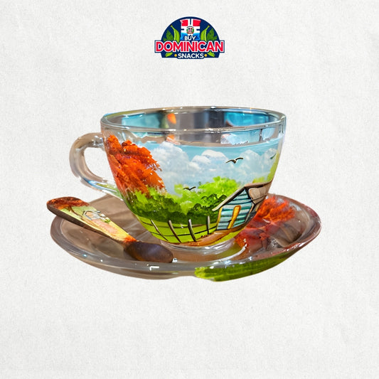 Taza y platillo de café de vidrio pintado a mano: Campo dominicano