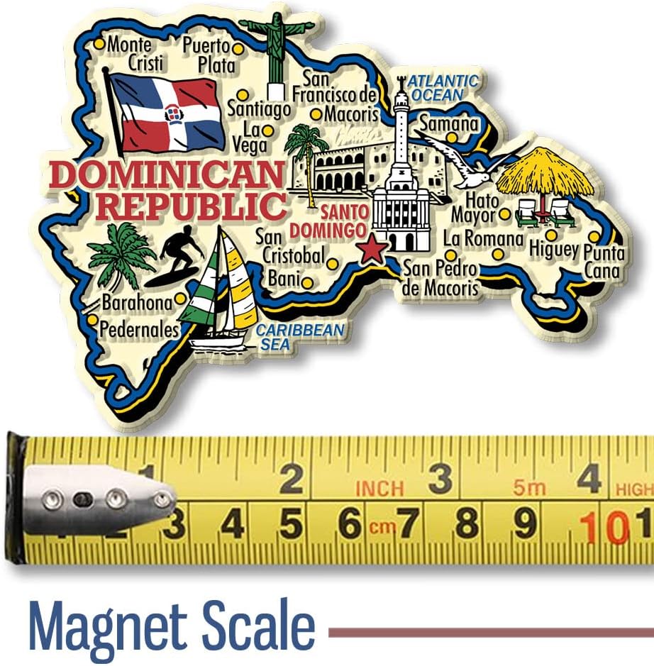 - ¡Este imán gigante de recuerdo de República Dominicana lo tiene todo! Iconos y ciudades dominicanas se presentan con gran colorido dentro del mapa del país.