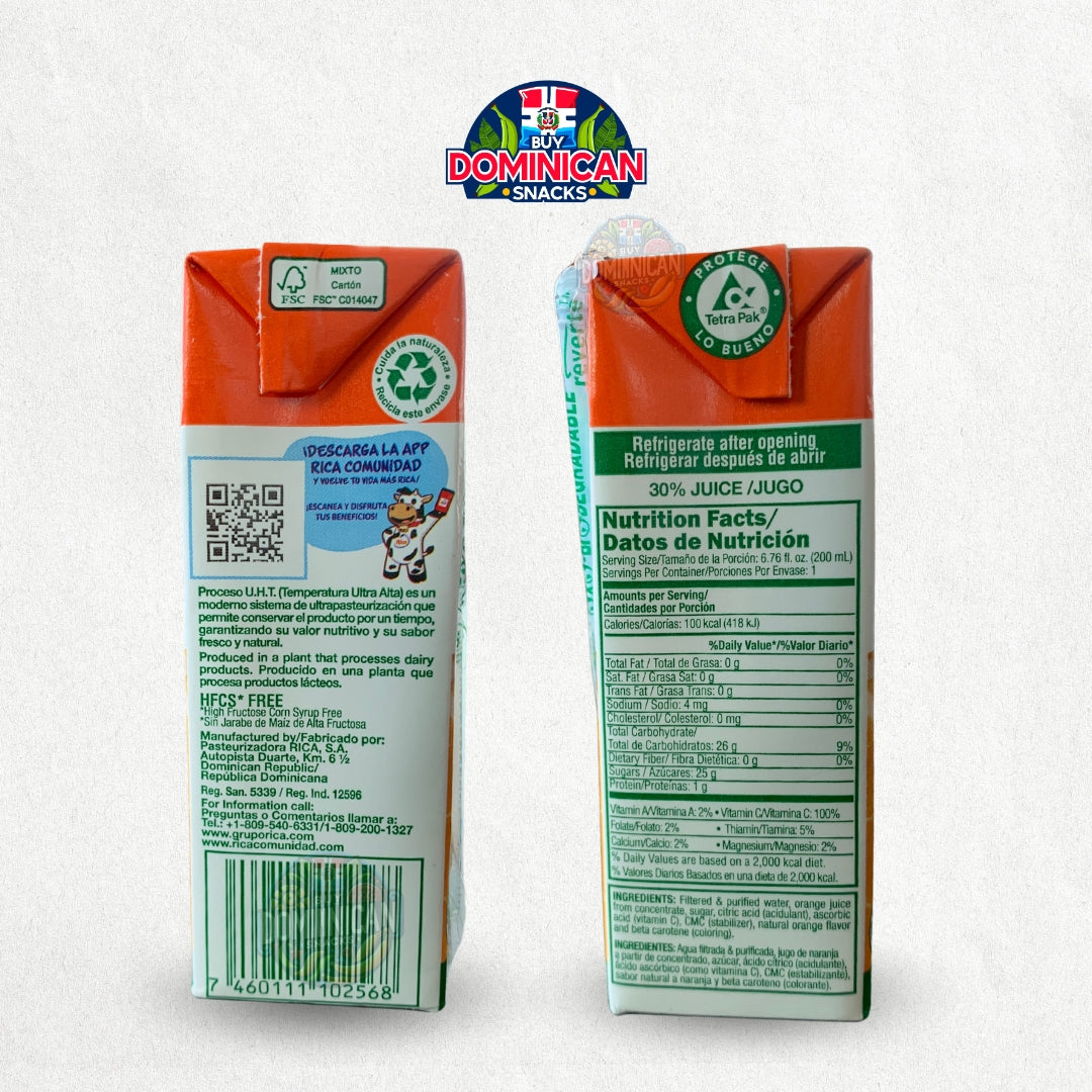 Revitalice sus sentidos con el sabor del sol tropical. Pida ahora el jugo de naranja Rica en envase de 200 ml y mejore su día con una explosión de delicias cítricas dominicanas.