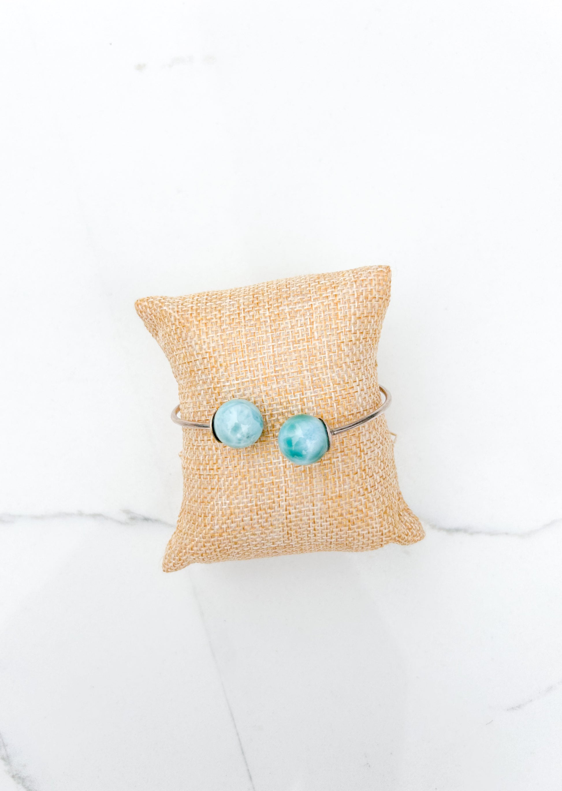 These stunning bracelets are made from 925 sterling silver, exuding a sophisticated charm. Each bracelet is elegantly finished with a terminal adorned with either rich amber or authentic Larimar, both sourced from the Dominican Republic. The sleek, polished silver combined with the vibrant hues of Dominican amber or the calming tones of Larimar creates a timeless accessory suitable for any occasion.