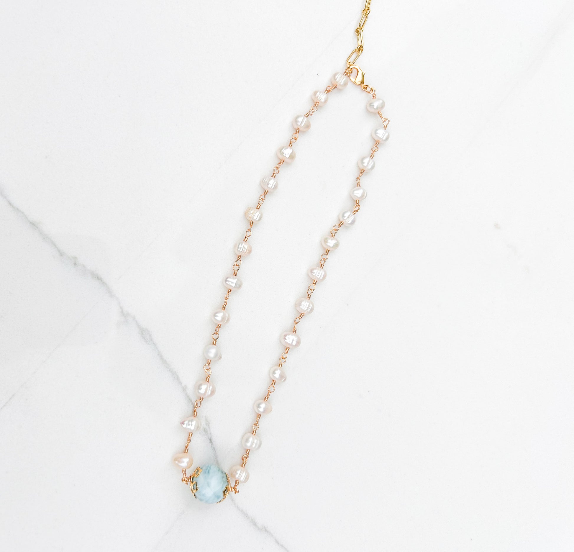 Gold-Plated Freshwater Pearl Necklace with Larimar Sphere Center- Authentic Dominican Larimar