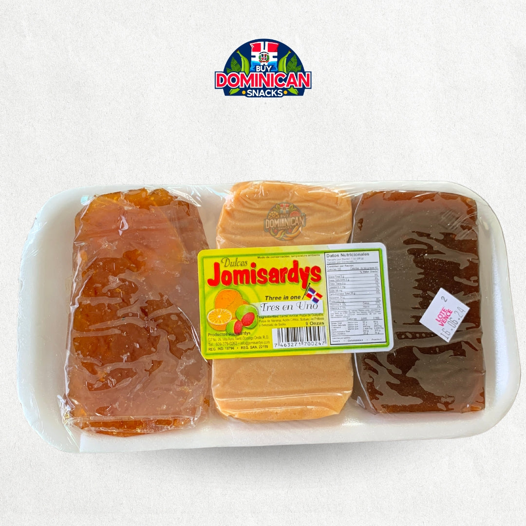 - 🍬 Jomisardys Three-In-One Delight: Guava, Orange, Sweet Milk - A 100% Dominican treat.