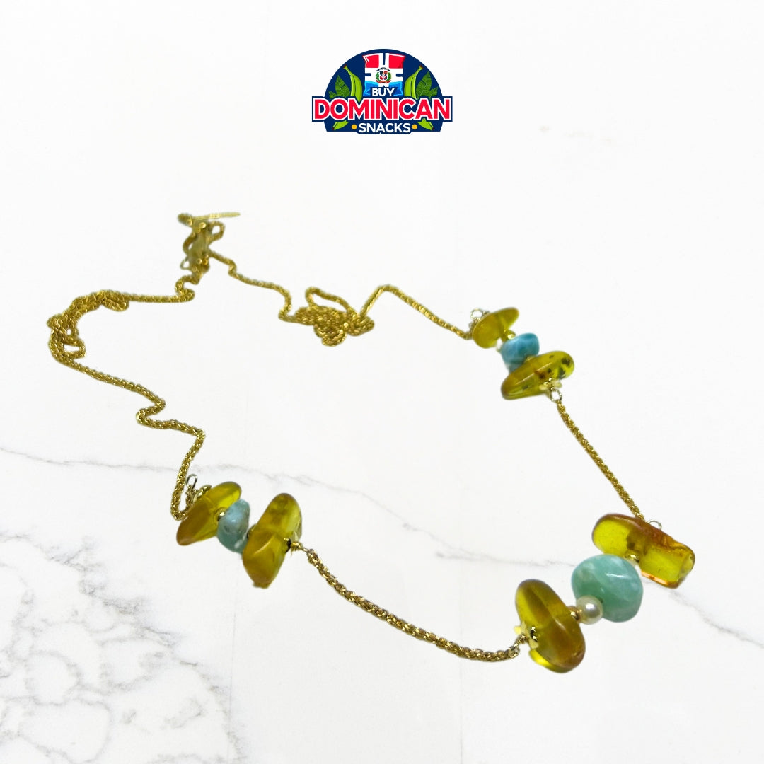 Long Necklace with 3 Sets of Larimar and Amber: A Beautiful Fusion of Dominican Elegance