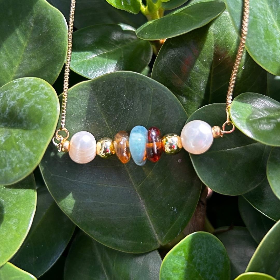 Gold-Plated Pearl, Larimar, and Amber Necklace: A Beautiful Harmony of Nature