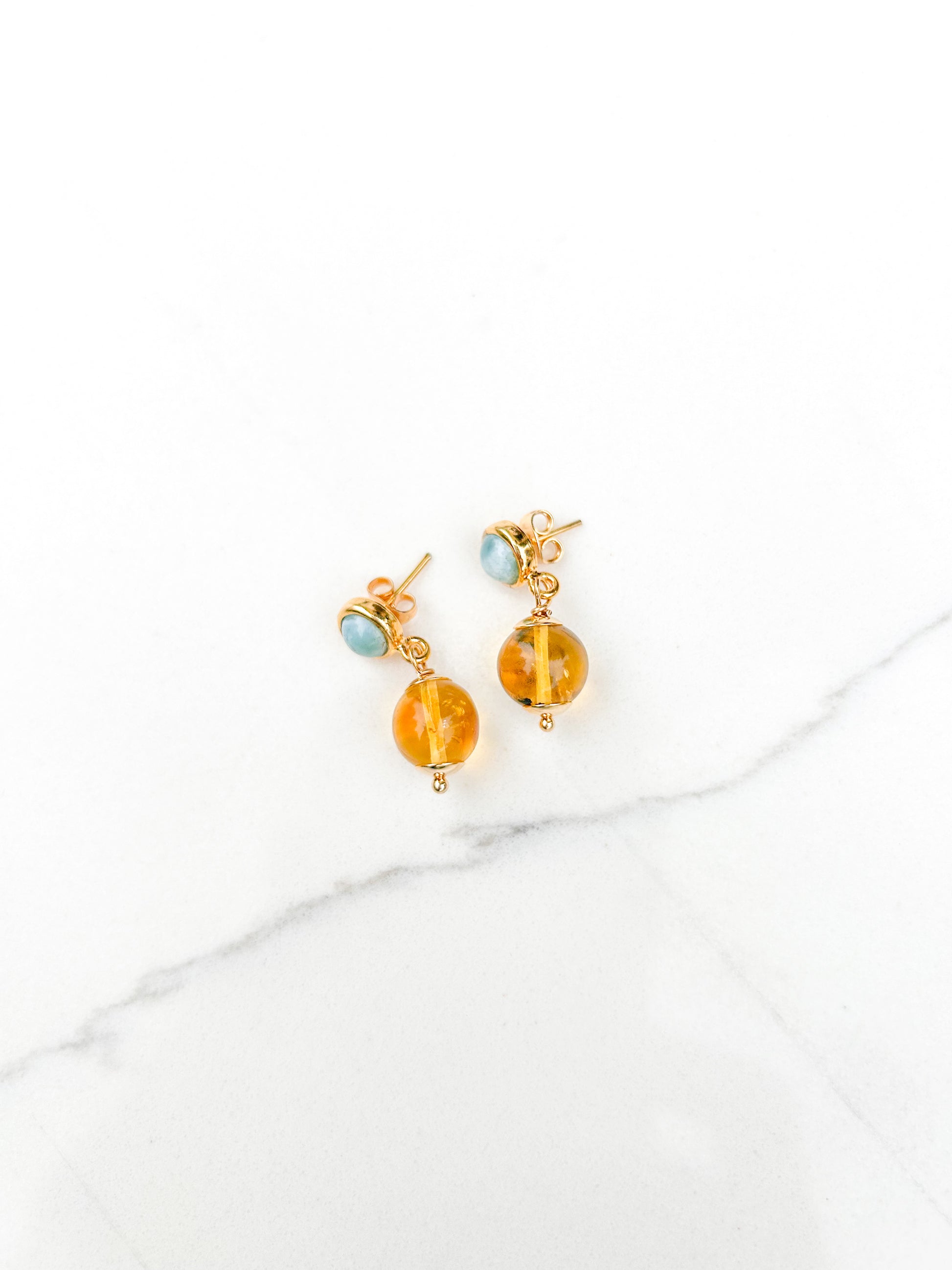 Silver Earrings with Larimar and Amber Sphere - Dominican Jewlery